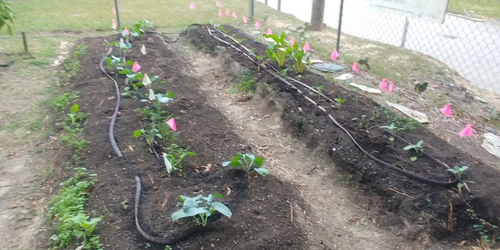 In October at the Saint Phocas garden, our peppers continued to produce, but our cucumbers gave up entirely and our tomatoes are down to just a few green babies that we hope will ripen before first frost. We tried growing broccoli and collards from seed, but found that a weekly visit isn’t enough to make sure that tender new sprouts are properly cared for so we bought seedlings and transplanted them. They are doing very well.