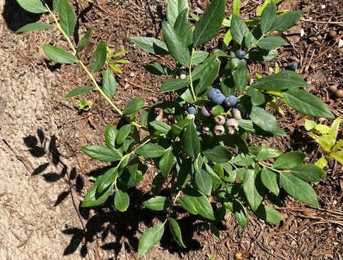 This month we staked our tomatoes with tomato cages provided by Carla Knip. We harvested the last of the peas. The blueberry bushes that we planted in honor of Jeffrey Hammond are producing fat berries even though this is their first year. There have been 3 or 4 berries to savor each week so far and they are delicious! We hope that Jeffrey picked a few for himself before he left and will help himself if he comes back to visit in June next year.