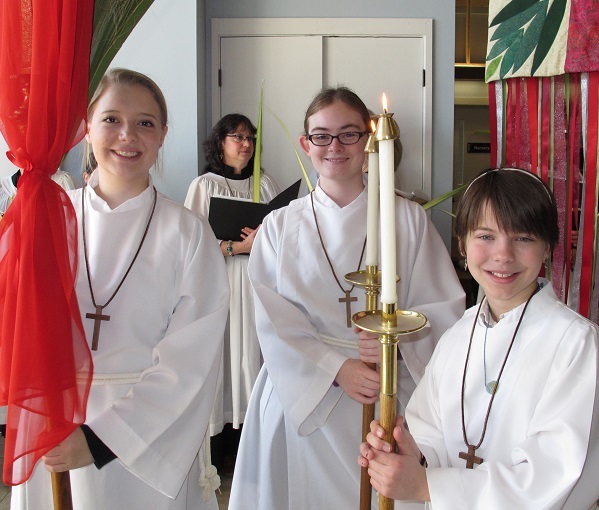 Acolytes assist in the worship service by carrying the cross and torches in procession, and by serving at the preparation of the altar for the Eucharist.