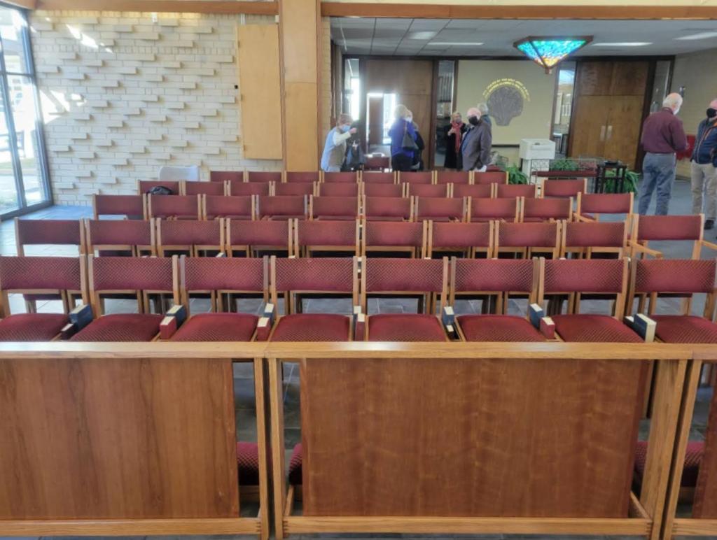 There are multiple seating sections of different sizes. There are also a few padded rocking chairs for those needing extra comfort or who might have a baby or small child to rock. Some of the regular chairs have arms for those who need them, and an usher can help you find the right seat for you.